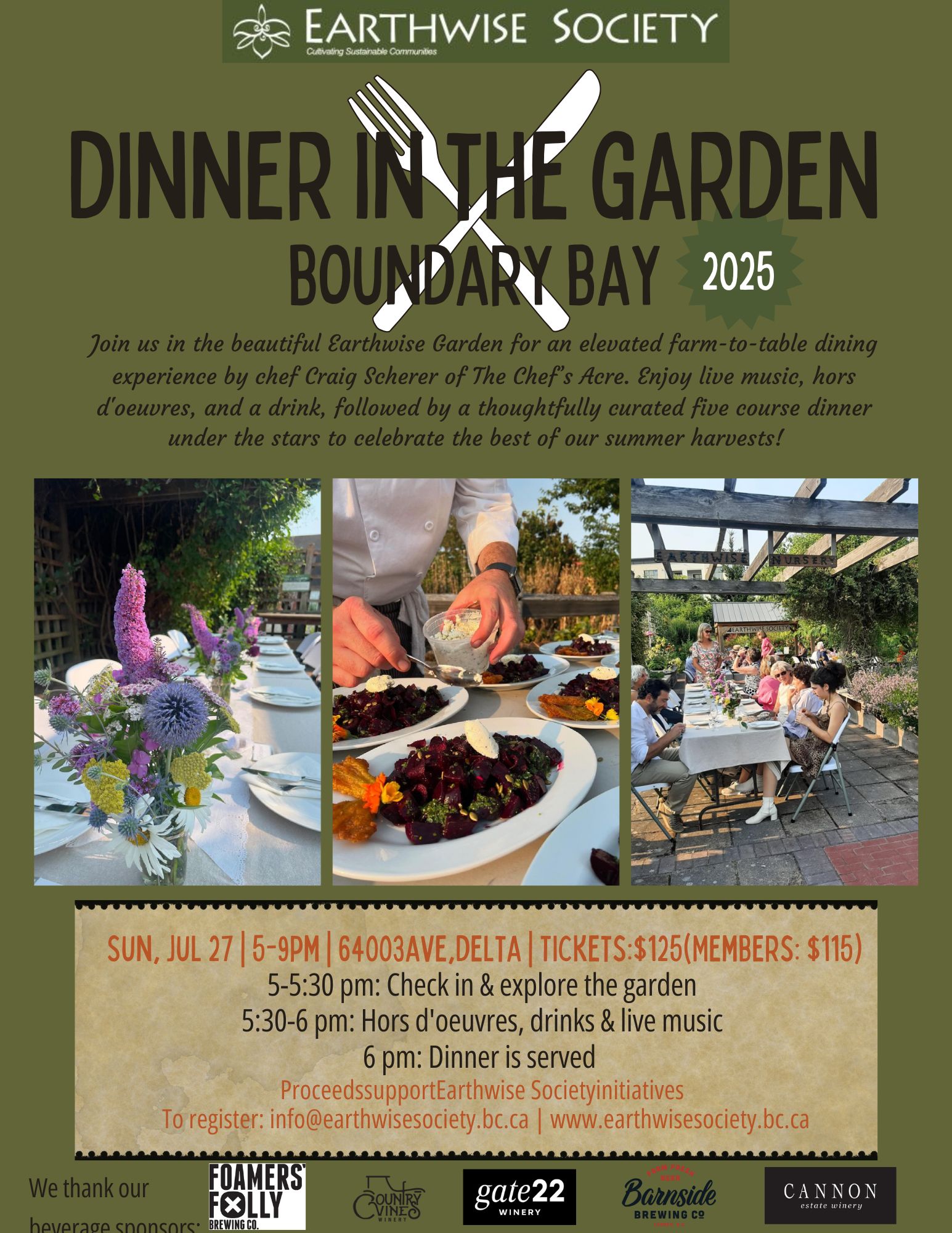 Join Earthwise Society in their beautiful demonstration garden for an elevated farm to table dining experience by chef Craig Scherer of The Chef’s Acre. Enjoy live music, hors d’oeuvres and a drink, followed by a thoughtfully curated 5-course dinner under the stars to celebrate the best of our summer harvests!