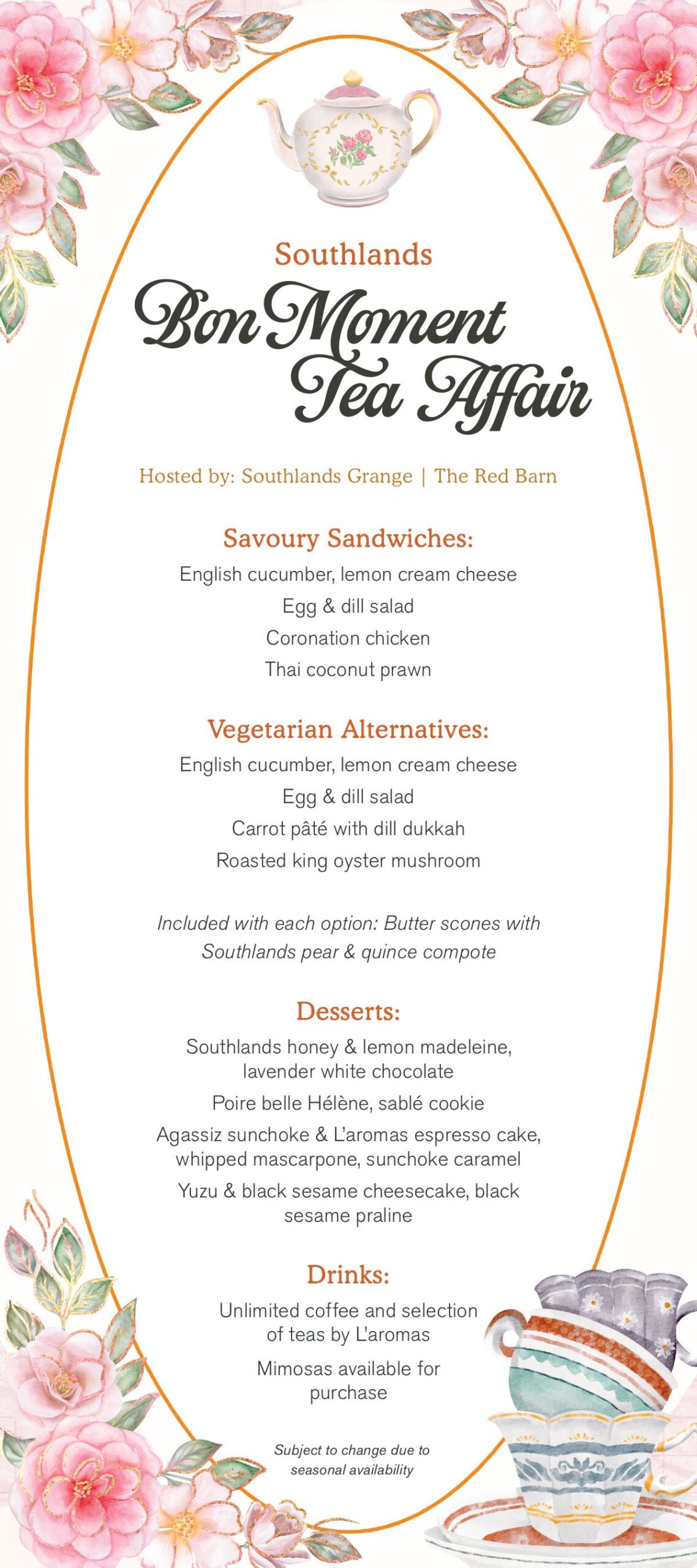 Indulge in an elegant afternoon tea experience brought to you by Bon Moment, featuring fresh, local produce from Southlands Farms. Your ticket includes a selection of delicious sandwiches, scones, desserts, and unlimited tea and coffee provided by L’aromas.